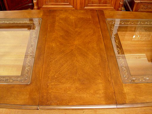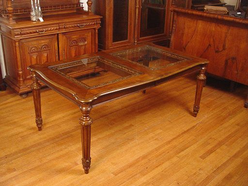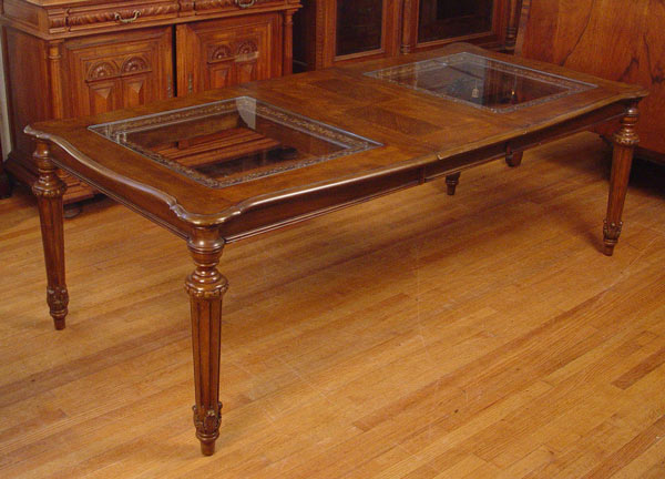 WALNUT DINING TABLE WITH GLASS INSERTS: Recessed glass panels framed in carved walnut. Turned legs. Modern manufacture. 1 leaf. Measures 30 1/2'' high x 72 1/2'' wide x 41 1/4'' deep.