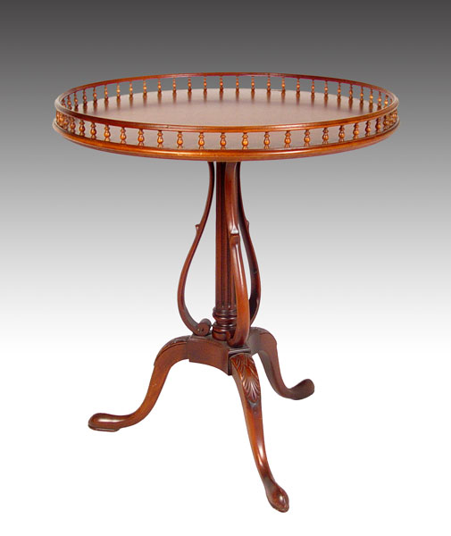 WEIMAN HERITAGE MAHOGANY PARLOR TABLE: Round top with gallery, delicate scrolls frame the center pedestal, cabriole legs. Measures 28 3/4'' high to top of gallery x 26'' top dia.