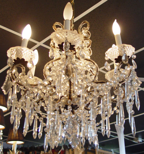 DIMINUTIVE ITALIAN CRYSTAL CHANDELIER: Chrystal prisms and chains. Approx. 23'' high x 20'' dia.