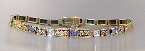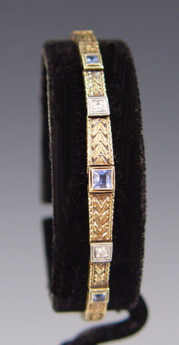 EDWARDIAN 14K & PLATINUM DIAMOND AND SAPPHIRE BRACELET Circa 1915-1920: 14K yellow gold and platinum bracelet contains 2 round full cut diamonds. Weight: .08 Ct. Approx. Rated VS in clarity and G-H in color. There are also 3 square step cut sapphires. Weight: .40 Ct. ( It is unknown if the sapphires are natural or synthetic). The diamonds are bead set in platinum trim. The sapphires are bezel set. Approx. 7'' Hidden locking closure with original figure eight safety clasp. Safety chain has been added. Weight: 11.7 grams.