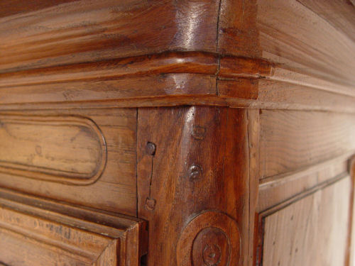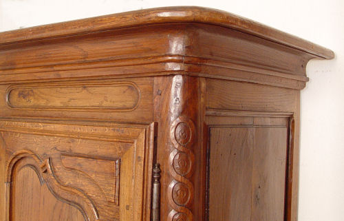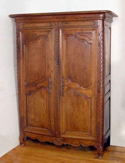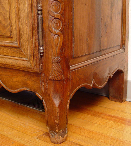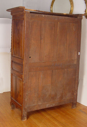 19th C FRENCH PROVINCIAL CABINET: Carved and molded walnut two door cupboard. Interior fitted with a later divider and shelves, all of which are removable. Peg construction. 73 1/2'' high x 55 1/4'' wide x 25 1/4'' deep.