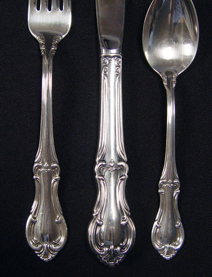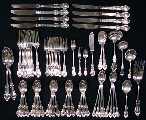 INTERNATIONAL STERLING JOAN OF ARC FLATWARE SET: 65 pieces in the Joan of Arc pattern by International to include 8 dinner forks (7 1/4''), 8 salad forks (6''), 20 teaspoons (5 3/4''), 2 tablespoons (8 1/4''), 8 iced teaspoons (7 3/8''), 8 dinner knives (9 1/4''), solid master butter knife (7''), 2 shell bowl sugar scoops (6''), shell bowl bon bon spoon (4 1/2''), shell bowl cream ladle (5 1/2''), shell bowl gravy ladle (6 1/4''), straight handle baby spoon (4 1/8''), round bowl soup spoon (6''), serving fork (8 3/4''), lemon fork (4 1/2''), oyster fork (5 1/4''). No monograms. Approx. 66 troy oz.