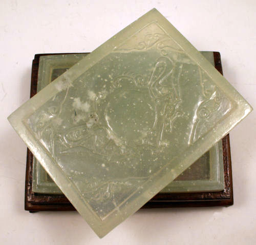 CHINESE CARVED JADE COVERED BOX ON STAND: Watermelon jade box measures 3/4'' high x 4 1/2'' x 3 1/2''. Stand measures 1'' x 5 3/4'' x 4 1/4''