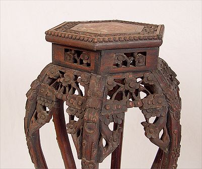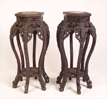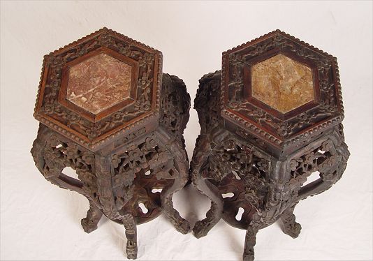 PAIR CARVED CHINESE PEDESTALS: Marble inserts on the intricately blossom carved stands. Measure 31 3/4'' high x 16'' dia at widest point.