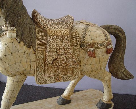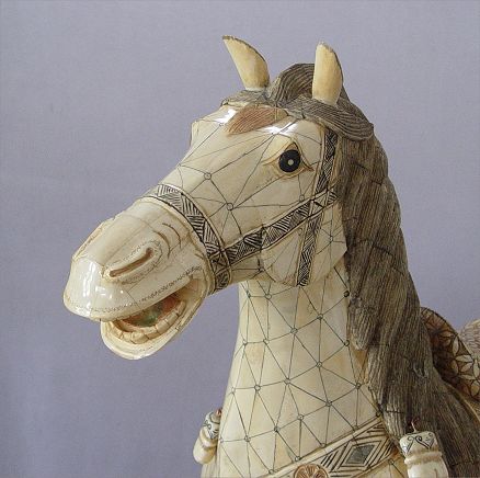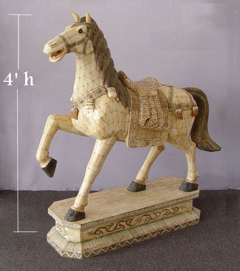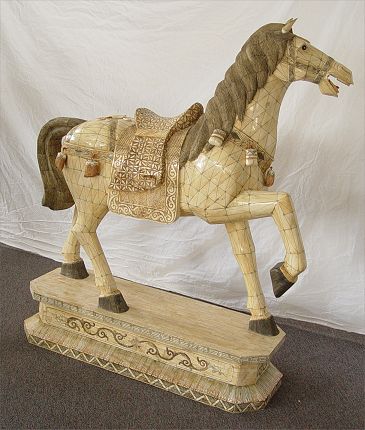 4 FT TALL CHINESE BONE CLAD HORSE: Ornately outfitted horse statue on base. Entirely clad in bone tile and carving. Approx. 4' tall x 42'' long x 13'' wide.