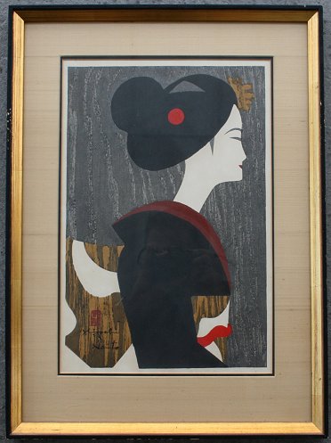 SAITO, Kiyoshi, (Japan, 1907-1992): Woman in Kimono, W/B, sight size 16'' x 10 1/2'', signed in the plate, encased in ebonized frame with gilt trim, showing minor wear, 22'' x 16''. Condition - Possible fading due to sun, several very minor spots of foxing.