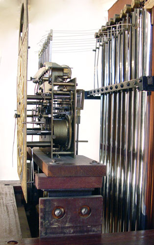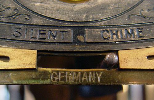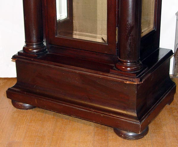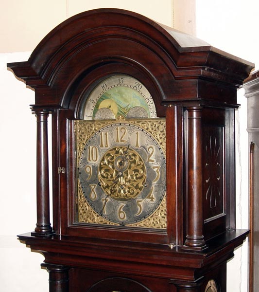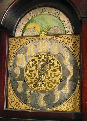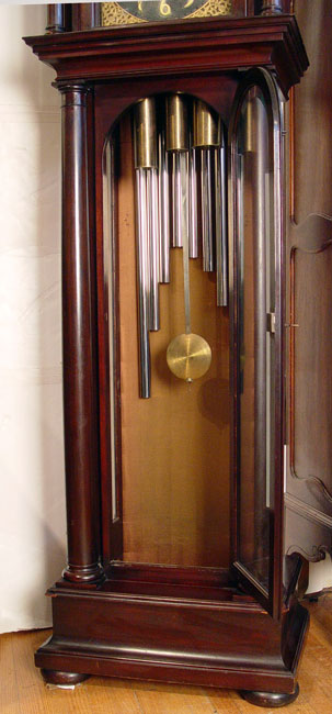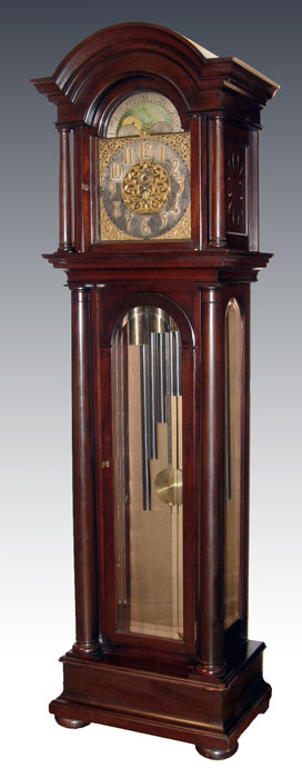 EARLY 20TH C BAWO & DOTTER 9 TUBE MAHOGANY GRANDFATHER CLOCK: Hand painted moon phase over a dial with forged numbers. Stamped B & D Limited on case and imported German works. Serial number 242059. 9 tubes in arch form, play 3 chimes. Full columns on body and bonnet, beveled glass on front and sides of body. Crank style key in office. Measures 90 1/2'' high x 25 5/8'' wide x 17'' deep. Note damage to front lower corner.