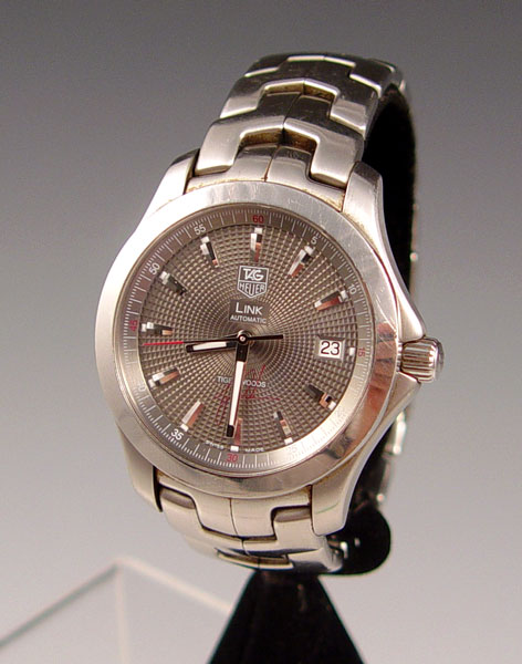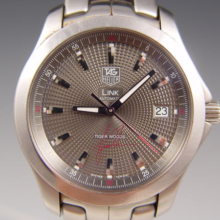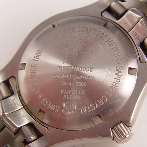TAG HEUER LIMITED EDITION LINK TIGER WOODS WATCH: Stainless steel watch and bracelet. Number 1974 in a limited edition of 5500 total production. Swiss made automatic movement in good working order. Date window at the 3 position. Sapphire crystal. Water resistant. Ergonomical Tag Heuer signed crown, dial and bracelet. Tiger Woods signed dial. Sold with Tag Heuer catalog book, COA, Guarantee Booklet and Card.