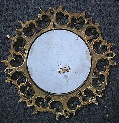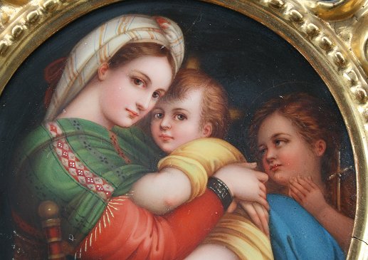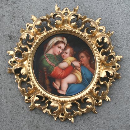 MADONNA DELLA SEGGIOLA (The Seated Madonna) AFTER RAPHAEL: Painted porcelain plaque, 6''dia., gilded pierce carved frame 11'', frame does have wear and repair, marked with Fleur de Lis Firenze.