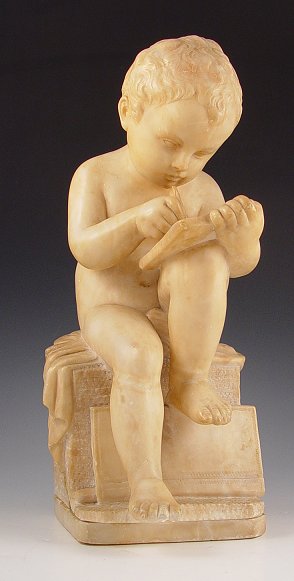 ALABASTER STATUE AFTER CANOVA: ''Boy Writing on Tablet'', 16'' t., 8'' d., 6'' w., scattered abrasions, repair to leg and base, has age and shows it. Sold as is.