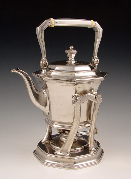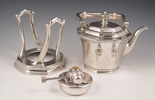 TIFFANY & CO OCTAGONAL STERLING KETTLE ON STAND & BURNER: 2 1/2 pint octagonal form marked on underside ''Tiffany & Co. Makers 21355 6276 Sterling Silver 925-1000 M''. Kettle measures 6 1/4'' high to top of finial x 6 1/2'' x 8 1/2'', articulated handle with bone rings. Stand and burner measure 6'' high x 6'' dia. Monogrammed ''C''. Approx 66 troy oz. Note dark age spots