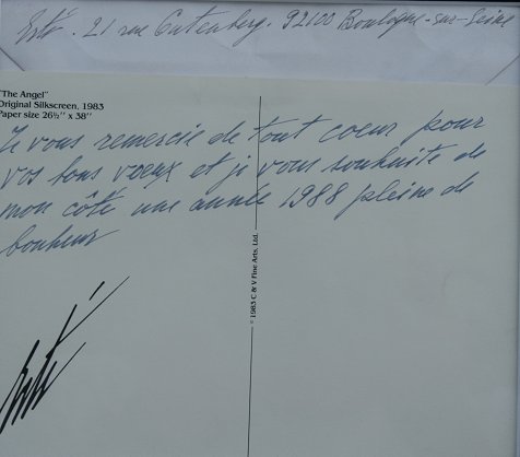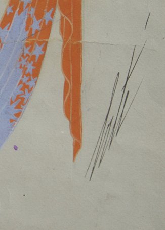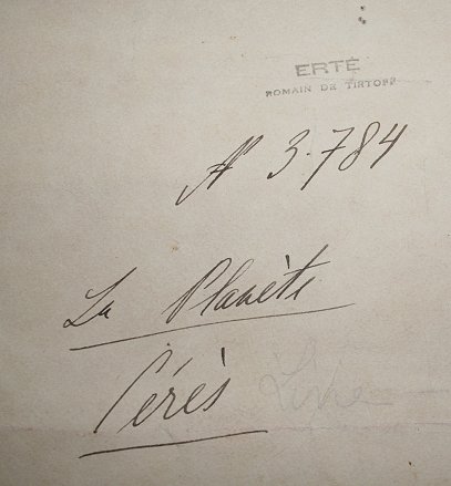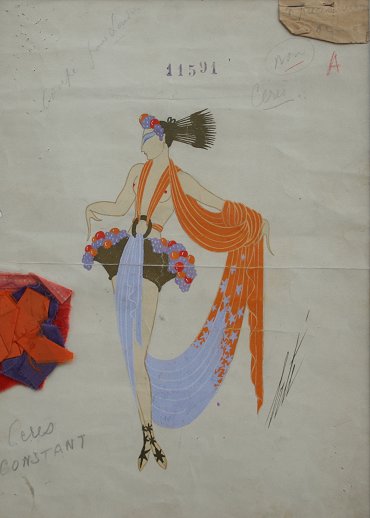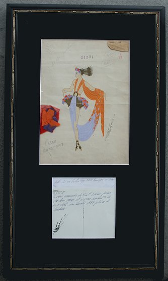 ERTE, (Russian, 1892-1990): Costume design Ceres, Gouache on notebook with fabric scrap, sight size 13'' x 10'', signed, stapled information upper right, stamped 11591, various illegible inscribed pencil writings, most notably Ceres Constant, sold with a postcard with photograph, possible dedication written in French, custom black frame 30 1/2'' x 18 1/2''. Condition - Major crease, pinholes upper left, scattered abrasions, scattered pinholes lower right, not examined out of the frame. From the collection of celebrated French entertainer and fashion designer Gildas Conan.