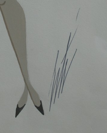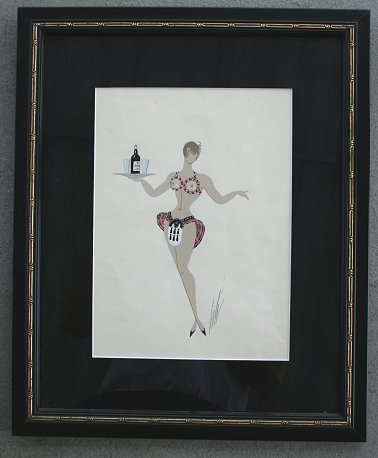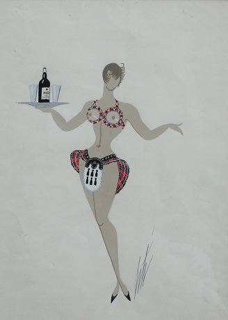 ERTE, (Russian, 1892-1990): Deco costume design, nude woman in Scottish costume, Gouache, sight size 14'' x 10'', signed, encased in custom black frame 22'' x 18 1/2''. Condition - Pinholes in upper left margin, not examined out of the frame. From the collection of celebrated French entertainer and fashion designer Gildas Conan.