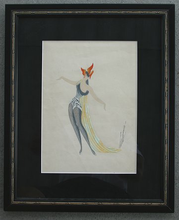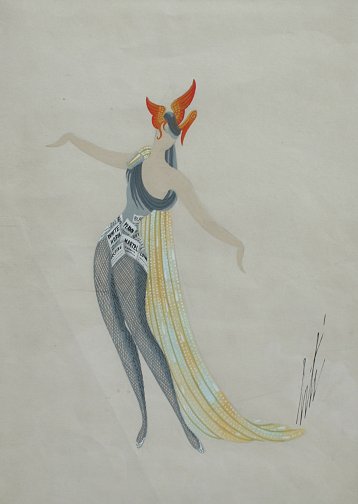 ERTE, (Russian, 1892-1990): Costume design with fishnets and cape, Gouache, sight size 14'' x 10'', signed, encased in custom black frame 22'' x 18 1/2''. Condition - Several pinholes, not examined out of the frame. From the collection of celebrated French entertainer and fashion designer Gildas Conan.