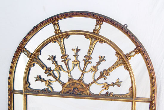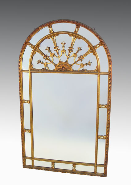 1920'S ART DECO GILT WOOD ARCHED MIRROR: Carved gilded wood with minor loss of gold. Measures 47 1/4'' high x 27 1/2'' wide.