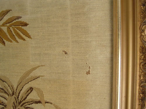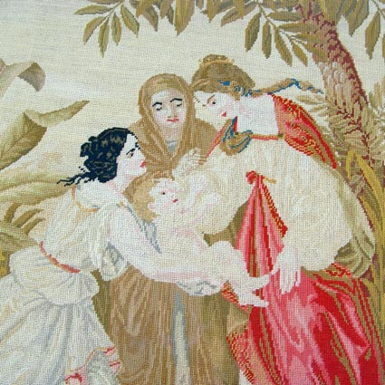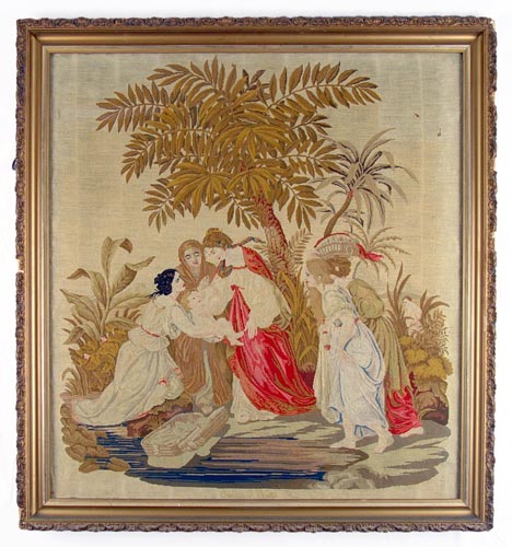 LARGE 19th C NEEDLEPOINT DEPICTING MOSES IN THE REEDS: Colors are good, there is a very small loss of thread in the background. Framed under glass in period frame with some loss of gesso. 38 3/4'' high x 36 1/4'' wide overall.