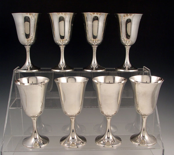 SET OF 8 MANCHESTER STERLING GOBLETS: Pattern 808. Note dent in one. Measure 6 5/8'' high x 3 1/4'' top dia. Approx 40.5 troy oz.