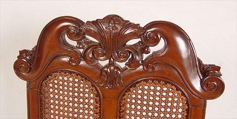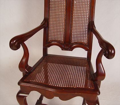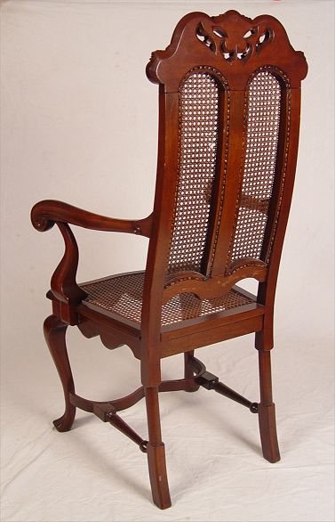 WILLIAM & MARY CARVED MAHOGANY ARM CHAIR: Molded and carved crest over a two caned panel back, scrolled hand olds, shaped and caned seat, curved stretcher. Refinished. 48 1/4'' high x 21 3/4'' wide x 20 1/2''. Note tear in cane square on the back panel.