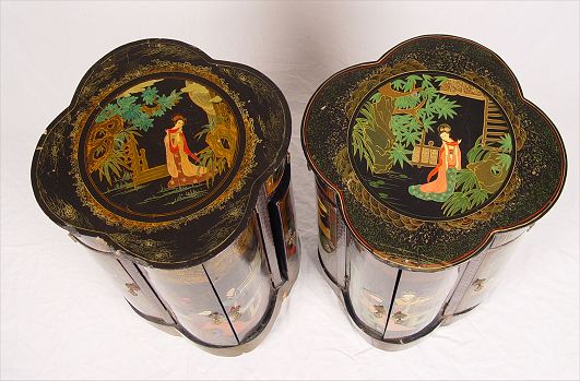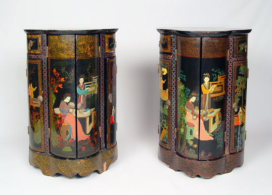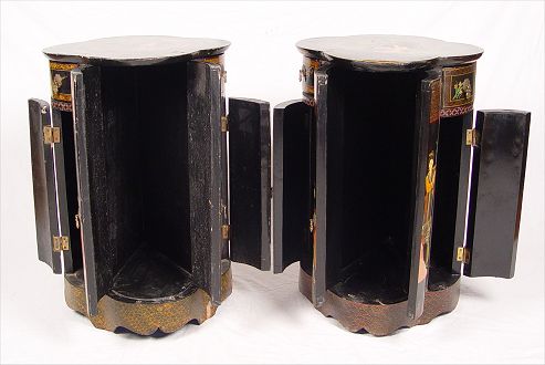 PAIR OF CHINESE LACQUER STANDS: Hand painted turn of the century 4 door stands. Please note chips. Measures 27 3/4'' high x 18 1/4'' x 18 1/4''.