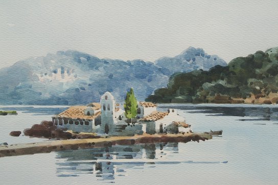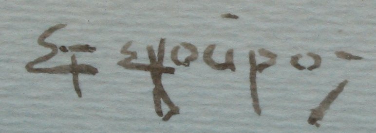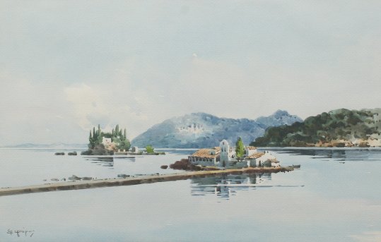 GREEK? HARBOR SCENE W/C: Signed in Cyrillic, image size 10 3/4'' x 16 1/2'', gold frame 16'' x 21 1/2''.