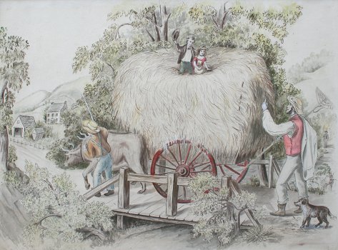 STEWART, W. (American, 19/20th C): Haying scene, Pencil, Pen and W/C, varnished on paper, sight size 16'' x 22'', signed, period frame with wear to gilded liner, overall 21'' x 26''. Condition - Foxing or mold in lower left corner, sold as is.