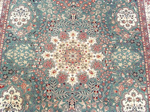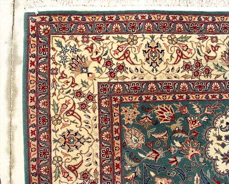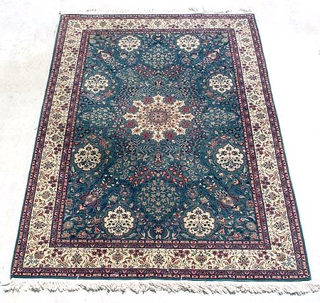WOOL SILK HAND KNOTTED RUG: Teal field with medallions. Measures approx 9' 1'' x 6' 1''