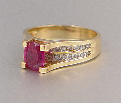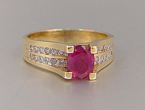 1 CT. RUBY with DIAMONDS RING: 14K yellow gold ring centers one oval shaped mixed cut ruby. Weight: 1.00 Ct. Approx. The ruby is rated VS in clarity (Type II), stpR in Hue, 3-4 in Tone and 3 in Saturation. Thirty round full cut diamonds. Weight: .25 Ct. Approx. Rated VS in clarity and H-I in color. The ruby is prong set. The diamonds are bead set. Weight: 3.6 grams. Size: 5.5