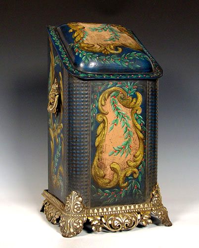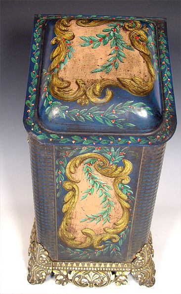 ORNATE PAINT DECORATED COAL BIN: Hand painted tin bin with ornate scroll feet. Later paint decoration. Measures 23 1/2'' high x 13'' square base.