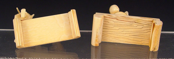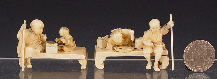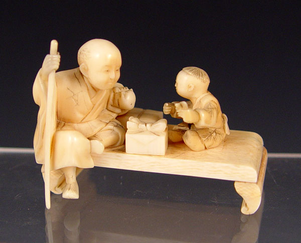 2 PIECE JAPANESE CARVED IVORY OKIMONO: To include 1) Man with child on bench with 2 presents. Unsigned. Measures 1 1/2'' high x 2'' wide. 2) Man on bench with child, present and dish, note man is loose and comes off. Measures 1 1/2'' high x 2'' wide.