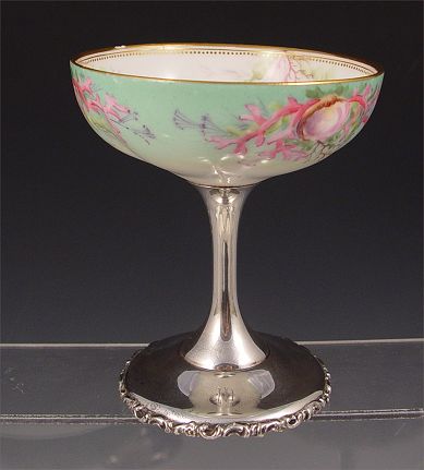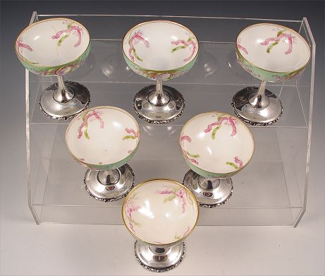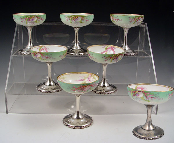 7 MAUSER STERLING BASE PORCELAIN SHERBERT DISHES: Mauser sterling base and stem with hand painted bowl top. Monogrammed on base. Measure 4 1/2'' high x 3 3/4'' wide. Note 3 have imperfections.