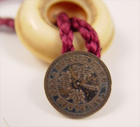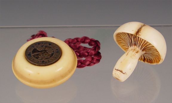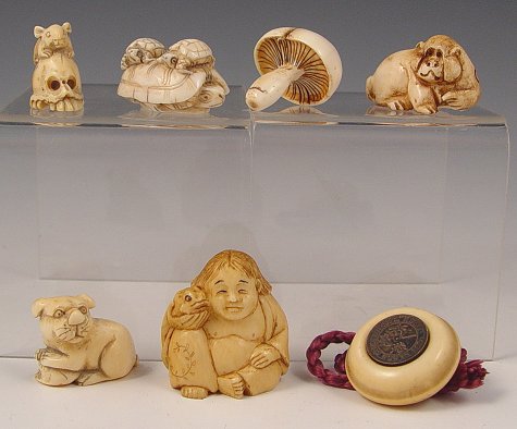 COLLECTION 7 JAPANESE CARVED IVORY NETSUKE: 1) Man with toads, signed in characters. 1 5/8'' high. 2) 3 Turtles, signed in characters. 3/4'' high. 3) Rat on skull, signed in characters. 1'' high. 4) Monkey, signed in characters. 7/8'' high. 5) Dog, signed in characters. 1'' high. 6) Button with 1875 Hong Kong Queen Victoria coin. 1 1/4'' dia. 7) Mushroom okimono, note hairline. 1 3/8'' high.