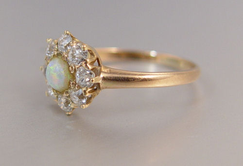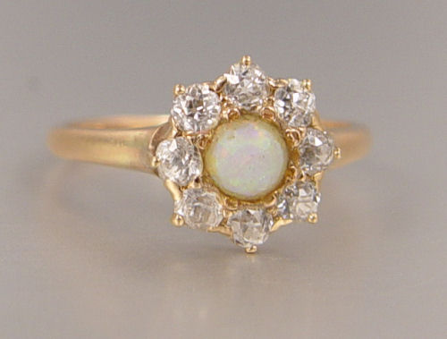 PERIOD OPAL AND DIAMOND RING CA. 1910-1920: 14K yellow gold ring contains 8 early old European round cut diamonds (2 diamonds are chipped). Weight: 1.00 Ct. Approx. The diamonds average VS-SI in clarity and I-J in color. At the center is a round 4.00 mm cabochon cut semi-crystal opal . Blue/green with red/orange play-of-color. Brightness: 1.5 (may improve with re-polishing). The diamonds are prong set. The opal is prong and glue set. Weight: 2.3 grams. Size: 7