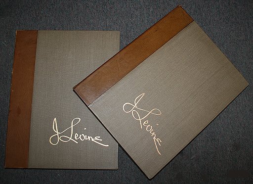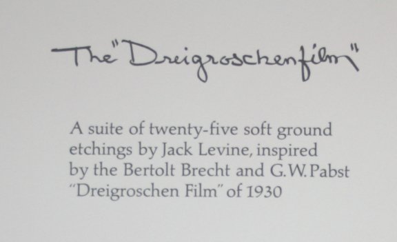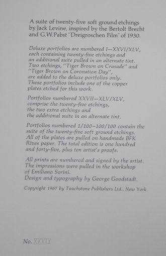 LEVINE, Jack, (American, 1915-): 2 Volume Set of Soft Ground Etchings, inspired by Bertolt Blecht and GW Pabst ''Dreigroschen Film'' of 1930. Deluxe portfolios each with 25 etchings and an additional suite pulled in an alternate tint, plus two etchings ''Tiger Brown on Crusade'' and Tiger Brown on Coronation Day''. One portfolio contains one of the original copper plates etched for this work. One portfolio numbered XIX, the other numbered XXXIX. Portfolio size approx. 18 1/2'' x 15'', etching size with margins approx. 17 1/2'' x 14''. All in all you have approx. 100 etchings plus an original copper plate (plate does have some pitting with rust), some wear to leather binder on both portfolios. Sold as a lot.