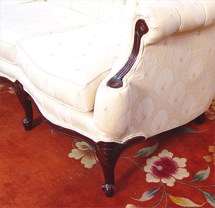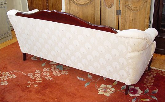 ELEGANT CARVED MAHOGANY SOFA: Shaped top rail, arms scroll outward, shaped skirt, cariole leg. Button and tufted upholstered back, 3 cushion seat. Measures 36 1/2'' high x 75'' wide x 34'' deep