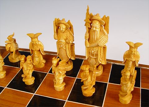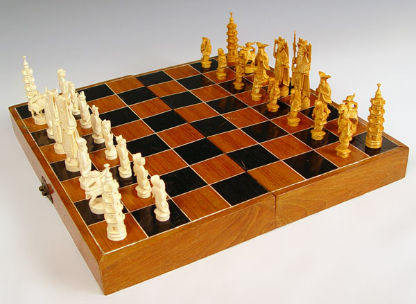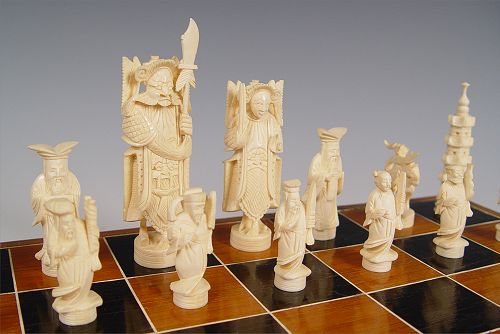 CHINESE CARVED IVORY CHESS SET: Complete set, King measures 4 3/4'' high. Each pawn carved with different face. Please note minor damage to several pieces. Comes with wood carrying box and board. Box measures 4'' high x 8 1/2'' x 17''.
