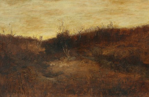 WHITAKER, George William, (American, 1840-1916): Tonalist Autumn Landscape, OIL/C, 16'' x 24'', signed, numbered 948 on the canvas verso, encased in contemporary but well styled gold frame, 22'' x 29 1/2''. Condition - Needs cleaning, small puncture left margin.