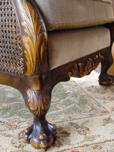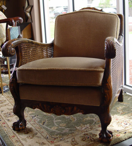 PAIR EARLY 20TH C CARVED AND CANED BERGERE CHAIRS: Caned backs and sides, acanthus leaf carving to the curved hand holds as well as the arm supports. Carved ball and claw feet. Green mohair upholstered back and seat cushions. Measure 32'' high x 29 1/'' wide x 32'' deep.