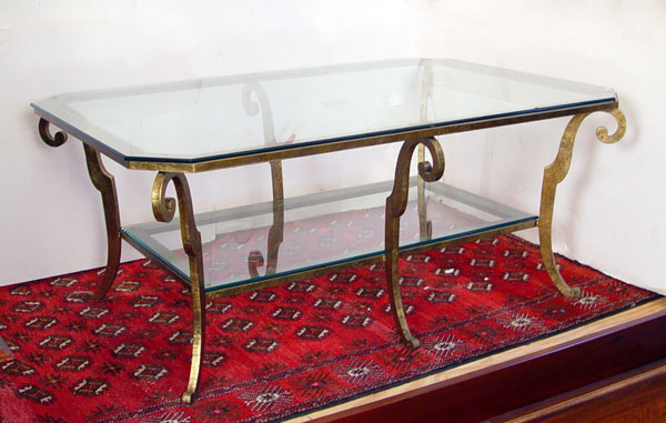 ETHAN ALLEN IRON 2 TIER GLASS COFFEE TABLE: Glass top and bottom shelf with gilded metal frame. Measures 24'' high x 56'' wide x 38 deep.
