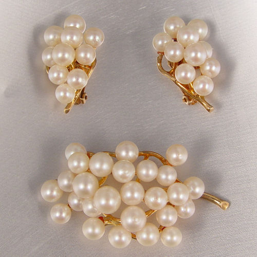 VINTAGE 14K CULTURED PEARL BROOCH & EARRING SUITE CA. 1950's: 14K yellow gold brooch and earring suite contains 46 cultured pearls, 5.50 - 7.00 mm. Cream in color, medium luster. The brooch and earrings depict stylized grape clusters. Brooch approx. 2 1/4:'' in length. Bar pin closure. Earrings are approx. 1'' in length. Hinged clip closures. Weight: 33.2 grams.