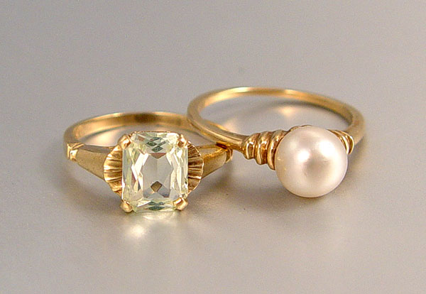2 GOLD RINGS, ONE WITH PEARL: 14K yellow gold ring with one 7.00 mm cultured pearl. Size: 6. One 14K yellow gold ring with one rectangular mixed cut unknown green stone. Size: 5 Weight: 4.5 grams.