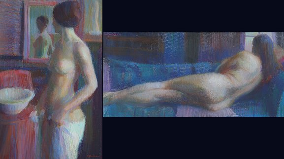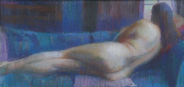 PAIR OF NUDE PASTELS SIGNED S. BARBER: Possibly Sam Barber, 1) Reclining Nude, image size 8 1/2'' x 18 3/4'', signed S. Barber, encased in wood frame, 18'' x 28''. 2) Standing Nude in Reflection, sight size 18'' x 12'', signed S. Barber, framed, 25 1/2 x 20''.