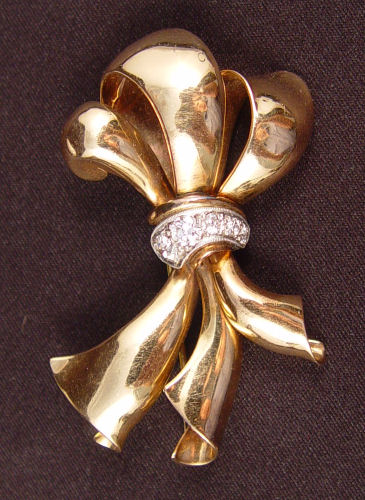 14K GOLD AND DIAMOND FIGURAL BOW BROOCH: 14K yellow gold brooch depicting a bow. 2 round full cut diamonds and 3 old European round cut diamonds, approx., total weight of .85 Ct. Rated VS in clarity and H-I in color. The diamonds are prong set. Weight: 16.3 grams. Approx. 2 1/2'' in length.