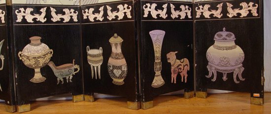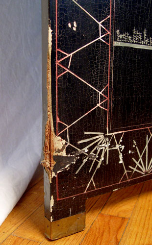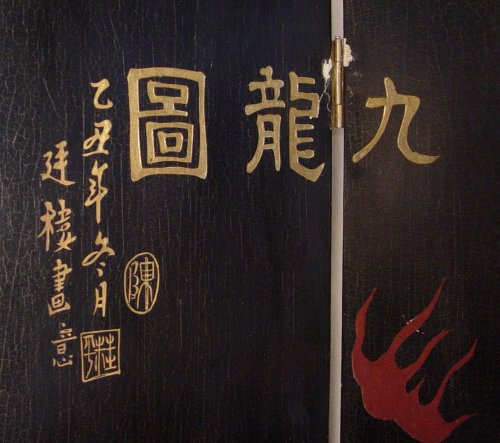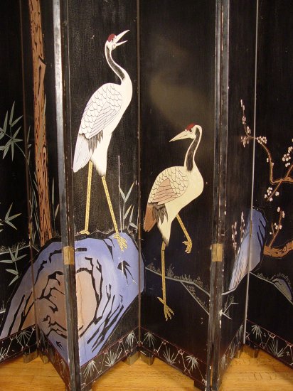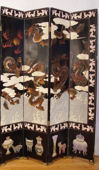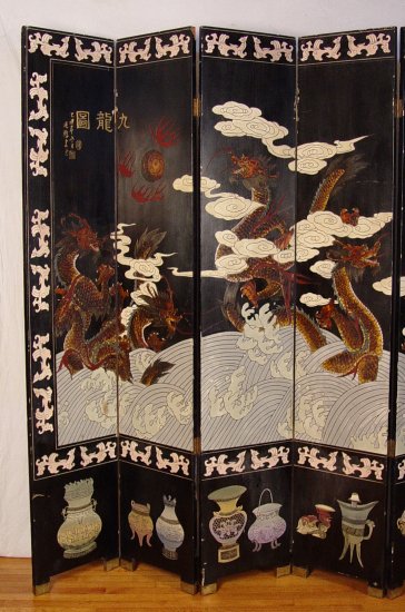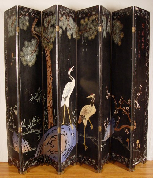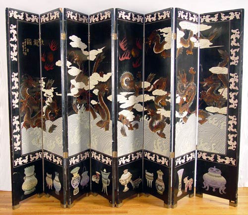 PALATIAL CORMANDRAL ORIENTAL 8 PANEL SCREEN: Wonderful polychrome gilt decoration of swimming dragons and flying fire balls, with cranes in a lakeside landscape verso. Signed on both sides. Please note overall wear, gouges, cracklure and paint chipping. Each panel measures 84 3/4'' high x 16'' wide.