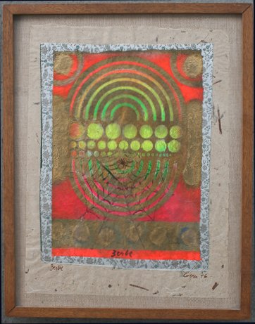 ZERBE, Karl, (American 1903-1972): ''Gem 46, Spider in the Chapel'', Acrylic Collage, 16'' x 12''. 1966 with Lee Nordes Gallery label affixed verso. Signed 2X, titled verso, framed in Plexiglas 19'' x 15'', Lee Nordness Galleries label verso. Zerbe was a professor at Florida State University 1954-1960's.