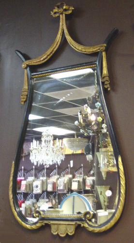 EARLY 20TH C FRENCH DECO BLACK AND GOLD MIRROR: Harp form, gesso and wood with a black and gold painted finish. Measures overall 46 1/2'' high x 25 1/4'' wide. Note areas of separation on bottom seam.