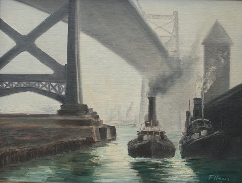 NICOSIA, Frank, (American, 1907-): Ben Franklin Bridge and Tugboats, Philadelphia, Oil/Canvas, 18'' x 24'', signed and dated 1970, original period wooden frame 20'' x 26''. Artist's information affixed verso, studied at Cooper Union Art Institute, member of the Philadelphia Sketch Club and Assoc. Member of the American W/C Society.