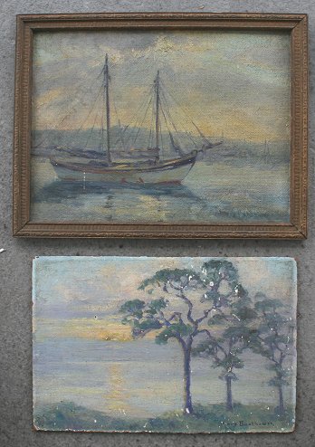 BURKHEIMER, Mary, (American, 20th C.): 2 Paintings, Harbor Scene and Coastal Sunset with Pines, OIL/Masonite, 9'' x 12'' & 10'' x 13'', Harbor scene is framed, 10 1/4'' x 13 1/4'', both pieces are signed. Both need cleaning, Harbor has small abrasion with paint loss, Sunset Pines has scattered paint fleck, no frame.