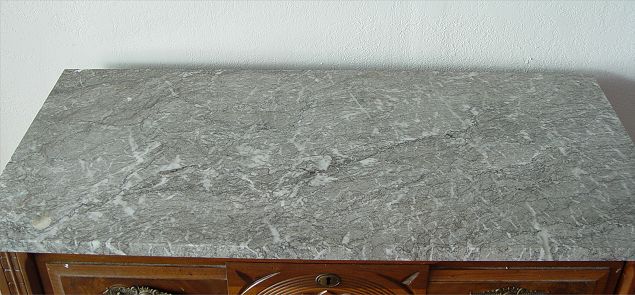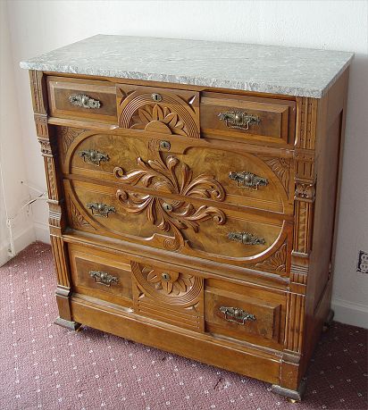 VICTORIAN CARVED WALNUT DRESSER WITH MARBLE TOP: Four drawer chest, carved drawers with burl panels, original pulls. 41''h. x 39'' x 18 3/4''.
