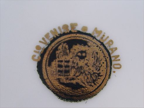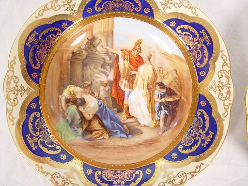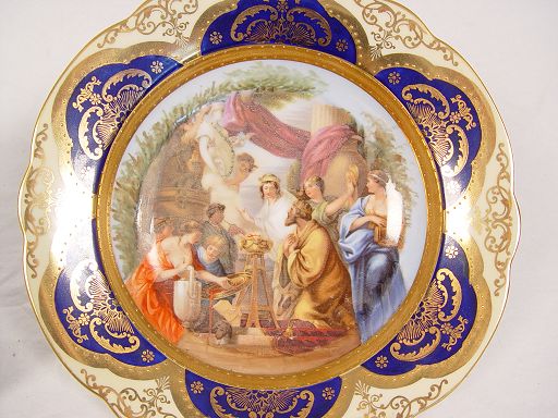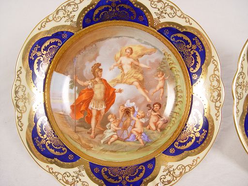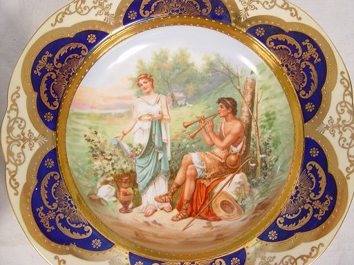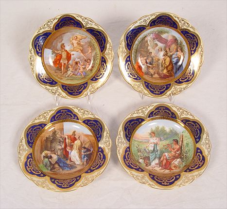 ITALIAN COBALT AND GOLD GILT DECORATED BOWLS: Set of four, centered by scenic transfers, highlighted by beaded gold gilt band, cobalt and gold gilt to rims, marked Cia Venise Murano. Please note wear to decals, tiny rim chip to one and small chip to base of another.