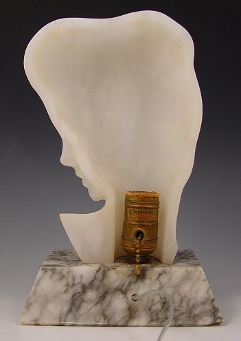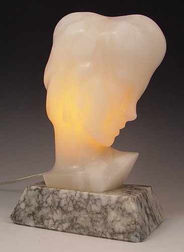 ART DECO CARVED ALABASTER LAMP: On a marble base (slight chip). Single socket. Shown in photo with an amber bulb. 11''h., base is 7'' x 4''.